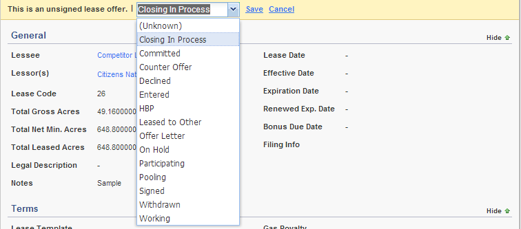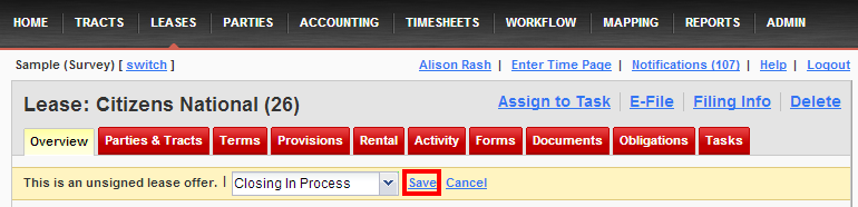 After selecting this lease's new lease status, click the Save link to the right of the drop down menu.