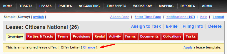 After opening the lease, click on the Change link, located on the lease's status bar.