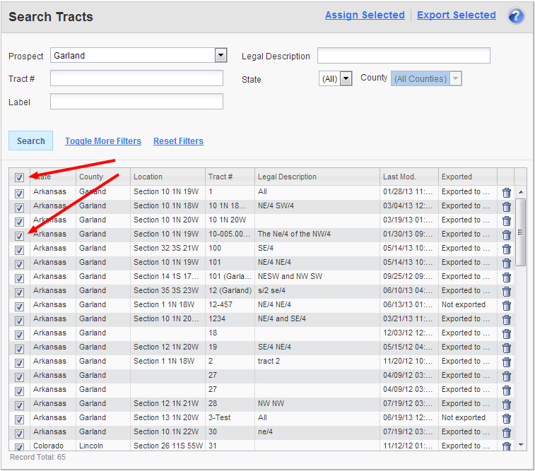 For example, if you would like to export an entire prospect's tracts, search by that prospect so the grid below is a list of all the tracts in that prospect.