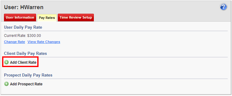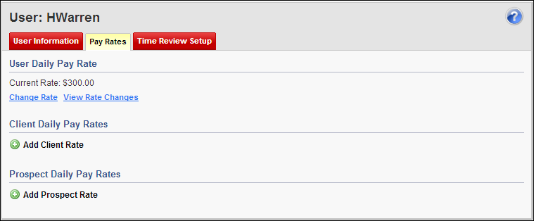 For example, below, user HWarren would be paid $300.00 a day for work he does for any client in any prospect, as there are no Client Daily Pay Rates or Prospect Daily Pay Rates set up that would override his User Daily Pay Rate.