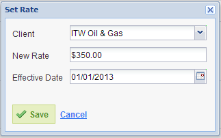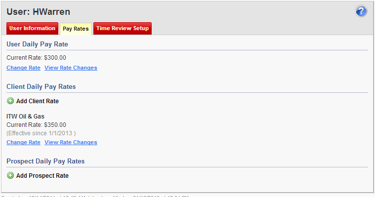 Let's examine HWarren's Pay Rates below; his User Daily Pay Rate is $300.00. That is the amount he will be paid unless it is overridden by a Client Daily Pay Rate or a Prospect Daily Pay Rate. HWarren has a Client Daily Pay Rate of $350.00, effective 1/1/2013, for the client ITW Oil & Gas. For the work he does for any job of ITW Oil & Gas since 1/1/2013, he'll be paid $350.00; for all other work, he'll be paid $300, his User Daily Pay Rate.