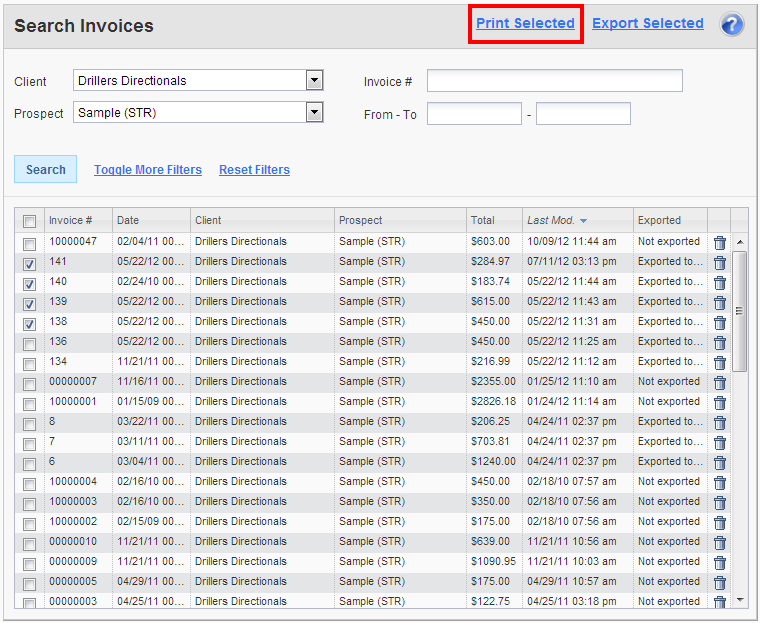 After selecting the invoices you would like to print, click the Print Selected link from the page header.