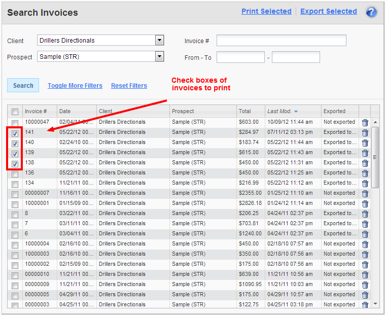 On the Search Invoices page, check the checkboxes to the left of the invoices you would like to print.