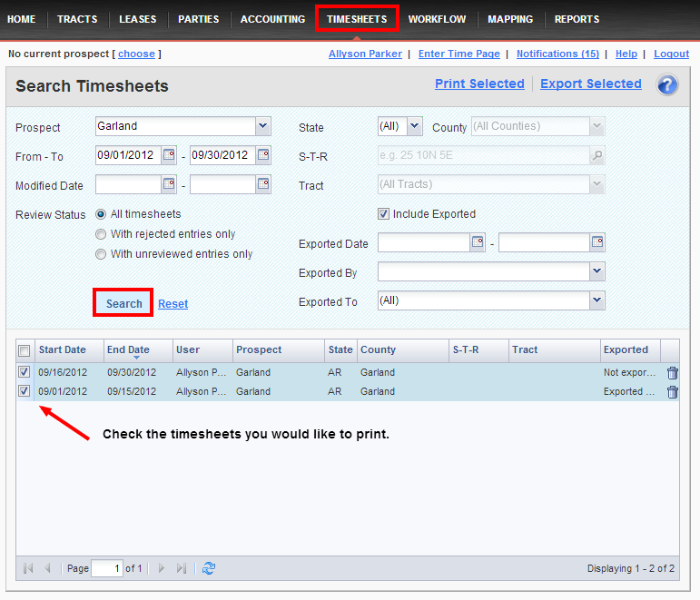 To print or export an existing timesheet, you'll first need to use the Search Timesheets screen to locate it. Clicking Timesheets in the main menu will take you to the Search Timesheets page, where you'll be able to use the search filters to locate the timesheet. Next, check the boxes to the left of the timesheets you would like to print or export to a .csv file (openable by Microsoft Excel).