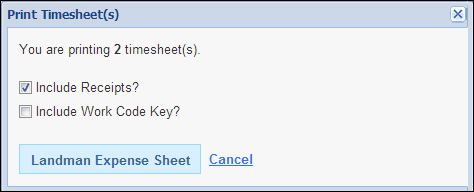 Next, on the Print Timesheet(s) message box, use the checkboxes to indicate whether you would like to include your receipts and a Work Code key. Click the Landman Expense Sheet button to open the file as a pdf.