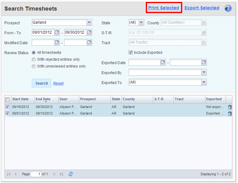 After selecting the timesheets you would like to print or export, click on either the Print Selected or Export Selected link the top of the page.